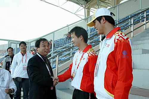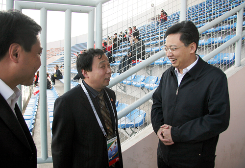 10月19日下午,校党委副书记杨向荣在团委书记陈伟的陪同下,来到第十一届全运会女足场馆,看望威尼斯官网大学生志愿者,并与同时到来的团市委书记陈飞亲切交谈,交流大学生志愿者工作。