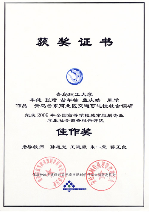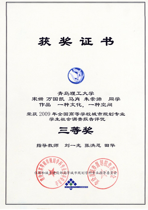 城规062班的宋姗、万国凯、马肖、朱崇帅同学的《一种文化,一种空间——青岛市延安二路老年公园“够级”现状与需求调查》报告获得三等奖(指导老师:刘一光、张洪恩、田华),城规061班牟健、张璞、苗华楠、孟庆皓同学的《青岛台东商业区交通可达性社会调研》报告获得佳作奖(指导老师:孙旭光、王建毅、朱一荣、蒋正良)。