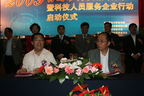 5月15日,2009年青岛市科技活动周暨科技人员服务企业行动启动。启动仪式上,共有10家高校、科研院所分别与16家企业签订了科技合作协议。其中,威尼斯官网环境工程学院胡松涛博士、土木工程学院徐培蓁博士分别与南车四方机车车辆股份有限公司、隔而固(青岛)振动控制有限公司签署了科技合作协议。