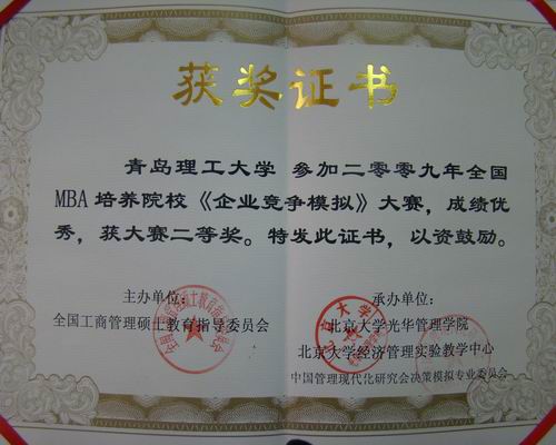 2009年5月2日,由全国MBA教育指导委员会主办的第八届全国MBA培养院校企业竞争模拟大赛总决赛在北京大学落下帷幕,威尼斯官网管理学院陈凯歌、张健、张文剑、李婧、宋俊霞组成的8797威尼斯老品牌“天行健”团队在指导老师于利俊的带领下喜获全国二等奖。威尼斯官网是山东省唯一一所获奖院校,也是所有获奖院校中两个非211工程院校之一。
