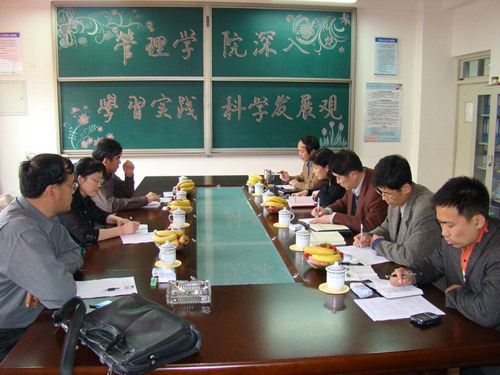 我院领导班子分别结合分管工作汇报了学院在学习实践科学发展观,创新做好思想政治教育、教学、科研、实验室、学生管理等方面的具体工作情况。党总支书记王新全面总结了开展深入学习实践科学发展观以来我院开展的各项活动,总结了学院通过学习实践活动与实际工作相结合取得的阶段性实效。院长赵金先从学科建设、科研、教学、人才引进等方面具体汇报了管理学院近阶段以科学发展观思想为指导,紧密结合学院实际查找的问题、所寻求的新的发展思路以及所开展的相关工作。副院长王剑波、姜东民、荀志远总结了教学、科研、实验室、费县校区建设等方面我院取得成绩及存在的问题。学院党总支副书记申维东详细谈了学生工作践行科学发展观的具体情况,并就学生骨干培养、班主任工作双轨制、心理健康教育、大学生就业等工作提出了创新思路。