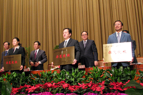 会议首先举行山东省首批大学生创业教育示范院校授牌仪式,由省委常委、常务副省长王仁元向仪垂杰校长授牌。