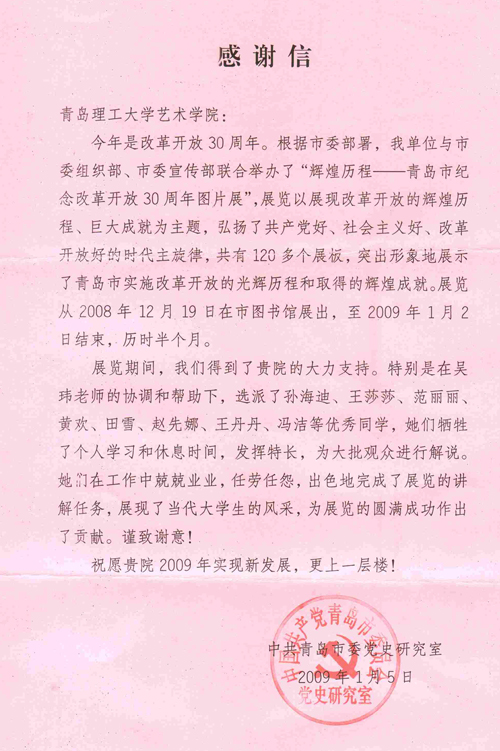 日前,中共青岛市委党史研究室发来感谢信,对艺术学院王莎莎等8名同学在“辉煌历程——青岛市纪念改革开放30周年图片展”中的志愿讲解表示感谢。