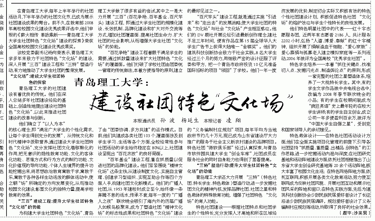 “百尺竿头”建设工程,就是通过实施“引进来”和“走出去”的发展战略,使大学生社团的特色“文化场”与社会“文化场”产生相互感应。他们的DV剧社开展论坛引进最新创作理念,建社不足三年时间,便有作品在第15届全球华人大学生广告节上获得大陆唯一“金犊奖”。他们的建筑科技创新协会致力于社会实践,8名大学生经过三个月的努力,用细致严密的设计征服了评委和甲方,把一个青岛市政府投资10亿元准备国际招标的项目“领回”了学校。他们一年一度的“义务编制村庄规划”项目,每年平均为当地政府节约几十万元,现已成为山东省建设厅大力推广的服务于社会主义新农村建设的品牌项目。特色社团“微软俱乐部”经过认真探索,与青岛市软件园共建大学生“创业车库”,社团成员在服务社会的同时自身能力也得到了显著提高。
