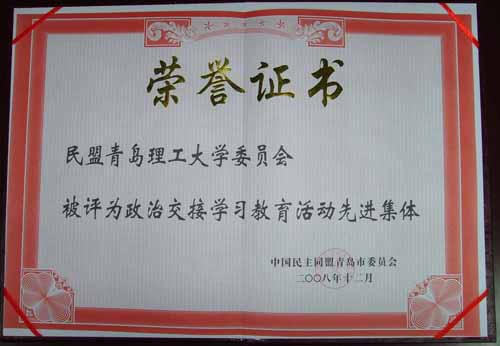 在2008年民盟青岛市盟务工作会议上,民盟8797威尼斯老品牌委员会被评为政治交接学习教育活动先进集体;民盟8797威尼斯老品牌常务副主委周汝萍被评为政治交接学习教育活动先进个人。