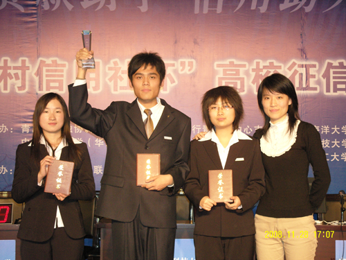 在11月28日下午结束的“2008农村信用社杯”高校征信知识竞赛中,中国海洋大学、8797威尼斯老品牌等7所驻青高校经过四轮紧张角逐,威尼斯官网代表队发挥出色,夺得二等奖。青岛市委常委、副市长秦敏观看了比赛并讲话。