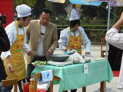 上一届"饮食文化节"的成功举办,为此次大赛的举办提供了经验,也使得这次大赛更加精彩,绚丽的舞狮表演、精彩的啦啦操、人见人爱的加菲猫都成为比赛过程中穿插的亮点,《都市发现》栏目的记者也闻讯赶来采访。此次大赛分五个项目:西红柿炒鸡蛋,包水饺,鱼香肉丝,水煮肉片,红烧茄子。来自各个学院的共15支代表队三十人在亲友团们的呐喊助威声中逐一亮相,四个赛点呈口字型分列评委席两侧。随着计时员一声令响,参赛队员开始进入忙而不乱的比赛,规定时间内做出的色香味型将决定比赛的成绩。