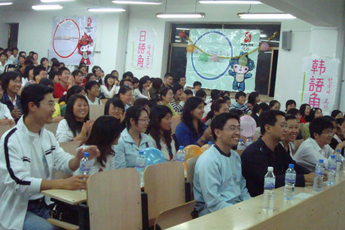 沙龙活动一开始,优美的日韩英歌曲大串烧将同学们带入了由外文音乐打造的美妙世界。随后,由外教Harlan带领大家进行单词接龙,现场气氛高涨,笑声不断。随着Free Talk的开始,同学们的情绪逐渐被充分调动起来,都积极踊跃地与外国留学生及外教进行交谈,整个活动现场气氛热烈活跃,真正起到了锻炼口语,充分交流的目的。