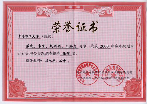 日前,由全国城市规划专业高等教育委员会主办的2008年全国城市规划专业大学生社会调查报告竞赛落下帷幕。建筑学院选送的四份报告中两份获奖,城规051班的岳本锋、王卉、郭春君、王晓菲同学的《宠物犬和人的空间争夺战》和苏诚、李慧、赵明明、王海龙同学的《还园于民、还景于民》两份报告获得佳作奖,为学校争得了荣誉。