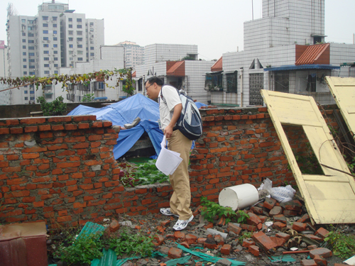 冒雨勘察女儿墙的破坏情况