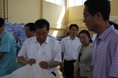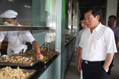 在黄岛校区校园中,从北院到南院,从学生公寓到学生餐厅,从新生报道处到临时停车场,耿书记一路检查,认真听取部门负责人的实地汇报,并详细询问和了解新生报道时宣传氛围的营造、人流车流的疏散、新生入住、食堂伙食等问题。当来到体育馆新生卧具领用处时,耿书记打开被褥,仔细查看了被褥的质量和舒适度。在学生食堂,耿书记现场检查了饭菜质量、价格及服务。