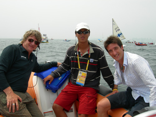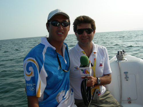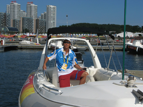 肖飞老师是威尼斯官网体育部奥帆赛四名志愿者之一,他所在的媒体船团队,主要负责海上5个场地比赛实况转播、新闻采访、摄影摄像工作的船艇驾驶。每天要安全及时、准确无误地将BOB媒体记者送到指定的海域,既不影响比赛,又要最近距离的拍摄比赛的精彩画面,直播或转播到世界各地。作为记者,他们希望越靠近比赛场地越好,恨不得像篮球记者坐在篮下拍摄一样,因此疯狂的不顾一切的催促要求。但是规定不允许靠近比赛场地,否则一但比赛船只冲了过来,船只相撞是小,影响比赛是大,这种矛盾天天都在发生。我们不得不一面控制好船只,尽量靠近比赛,做到“有朋自远方来”的热情,一面通过翻译,不厌其烦的一遍遍给他们解释比赛规则和大会的规定,最后达成谅解使他们接受,和谐共处,共同完成任务。每次返航,当我们看到他们竖起大拇指称赞和感谢我们时,就在心底里感到作为一名中国志愿者的自豪。
