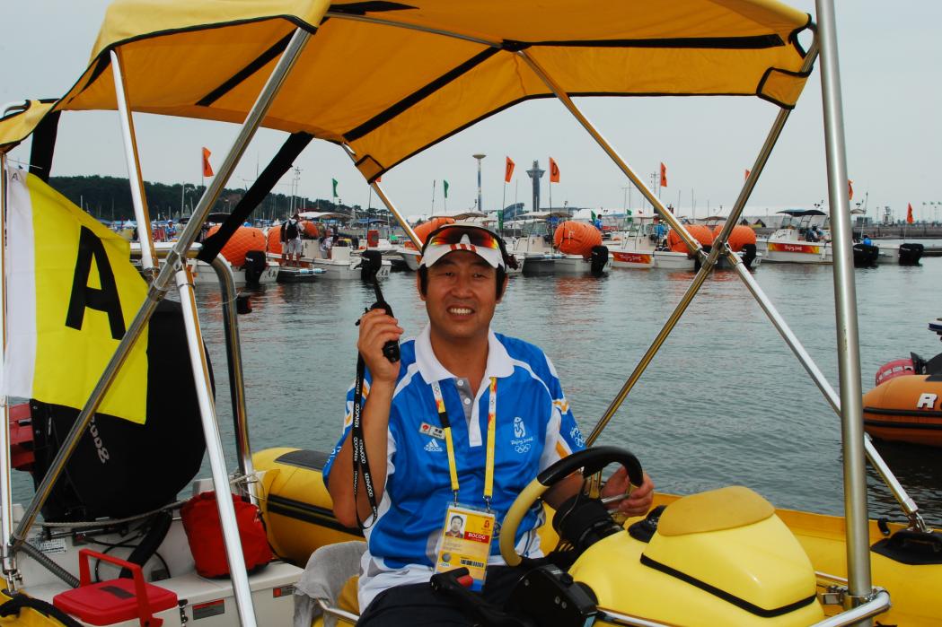 8月12日,天气非常炎热!不过比赛还是很顺利地进行着。吕杰老师在D场地男女470级比赛现场服务,因为风的问题,比赛延时1小时进行,当志愿者们回到岸上的时候已经快6点了,不过他们非常顺利地完成了今天的工作。