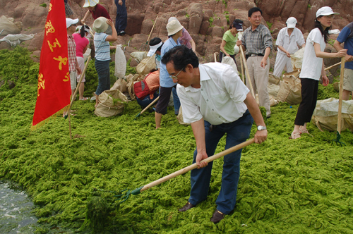 7月3日,理学院党总支教工党员志愿者在党总支书记徐学清、院长王谦源的带领下冒着高温酷暑到海边清理浒苔,并发出清理浒苔志愿活动的倡议。倡议书内容如下: