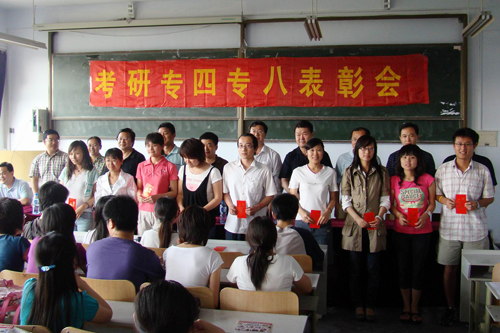 为进一步提高教育质量,加强学风建设,浓厚学习氛围,树立典型,表彰先进, 6月26日,外国语学院隆重举行考研、专四、专八表彰大会,表彰2008年考取研究生的学生,以及2007年英语、日语专业四级,2008年英语、日语专业八级考试成绩突出的学生。