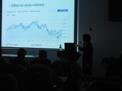 自2007年以来,比98年亚洲金融危机影响更大、更深远的次贷危机波及了欧美各国,给全球的经济、金融带来了很大影响,成为全球关注的焦点问题。张新华教授就这个问题,用通俗易懂、深入浅出的语言给大家作了详细的介绍。张教授首先从房地产的泡沫问题入手,对此次次优级抵押贷款危机的背景进行了介绍。接着,她又对引起此次危机的原因进行了详细的分析,分别从借款人、银行、政府等方面进行了说明。然后,张教授又用图例说明了此次危机对股票、银行、房主、经济的影响。接着,她又对美国政府对此次危机采取的措施进行了说明。最后,张教授与在座的老师、同学进行了交流,就中国的目前的房地产业形势、贷款问题进行了讨论,对同学们普遍关心的未来就业、买房问题进行了解答。