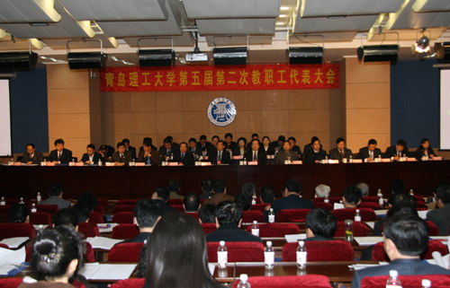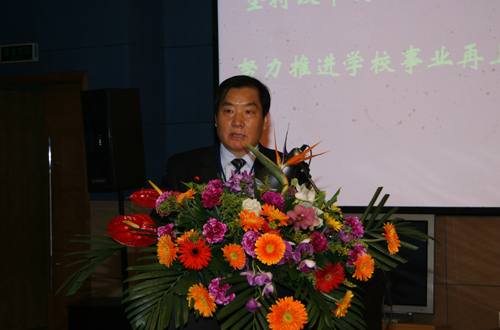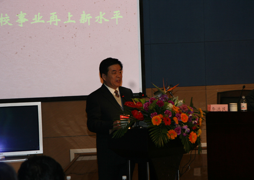 仪校长指出,2007年是学校继往开来和谐发展的一年。一年来,全校认真贯彻落实科学发展观,紧紧依靠广大教职员工,以“评建创优”工作为重点,大力实施“人才强校、质量立校、特色兴校”战略,抓机遇,谋发展,攻坚破难,锐意进取,学校事业呈现出强劲的发展态势。主要表现在:教职工生活条件明显改善,和谐奋进的氛围愈加浓厚;本科教学工作水平评估成绩优秀,教育教学质量显著提升;学科建设再上新台阶,产学研合作不断加强;人事分配制度改革不断推进,师资队伍水平进一步提高;大学生思想教育工作不断加强,学生奖助工作体系不断完善;招生继续保持良好势头,学生就业创业成效显著;黄岛新校区和教育小区奠基,办学条件明显改善。