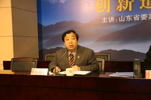 3月25日下午,由人文与社会科学学院、党委宣传部、学生处、团委共同举办的校园文化建设品牌工程——“新世纪讲坛”举行开讲仪式。省委高校工委副书记、国家教育发展专家咨询委员、中国高等教育管理研究会副会长、中国海洋大学博士生导师、山东大学博士生导师、威尼斯官网特聘教授田建国到场祝贺并讲话。校长仪垂杰在仪式上讲话,党委副书记杨向荣主持仪式,副校长李东出席。600多名学生代表、学生工作干部及部分教师参加仪式。