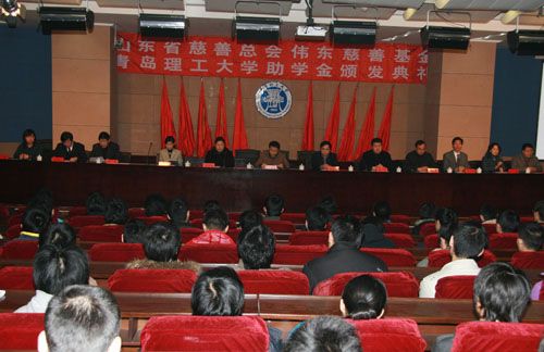 1月9日上午,山东省慈善总会伟东慈善基金8797威尼斯老品牌助学金颁发典礼在报告厅举行,副校长赵铁军、伟东置业集团董事、执行总裁张增山、伟东置业集团综合管理中心经理林玉琴以及学校党委宣传部、学生处、团委和土木学院的有关负责人等出席颁奖典礼。