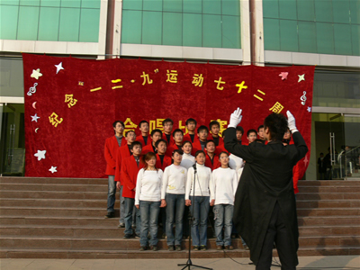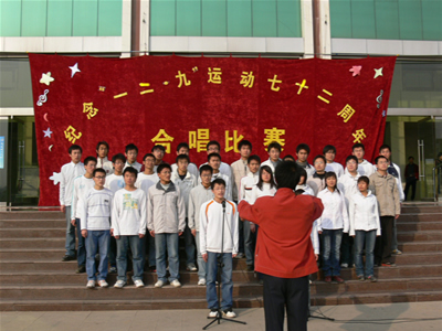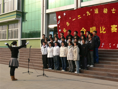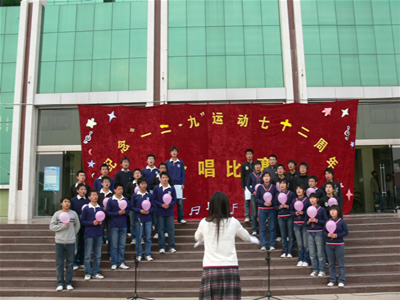 12月9日下午,费县校区纪念“一二.九”运动七十二周年合唱比赛在办公楼前广场隆重举行,副校长阚凤才、校区办副主任王建启等领导、老师和全体学生到场观看。