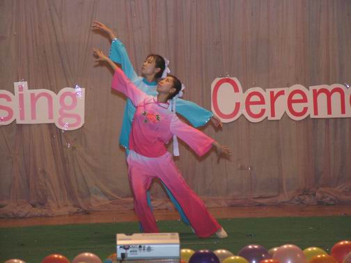 晚会将颁奖和汇报演出穿插进行,融会歌、舞、话剧、武术于一体:开场曼妙轻盈的舞蹈《恰恰》让人大饱眼福,外文歌曲大串烧让观众感受了异域风情,动感十足的街舞用他们激昂的舞步展示了青春魅力;舞蹈《梁祝》缠绵委婉、满含深情,让所有观众动容,掌声迭起;武术双截棍和跆拳道表演的一个又一个高难度动作,令人叹服,不时引其阵阵欢呼;英语短话剧《深山里的呼唤》,以惟妙惟肖的表演,让大家深深理解了深山里的孩子们对读书的强烈渴望,更让大家明白应珍惜学习机会,担负起肩上那份沉甸甸的责任。在师生大合唱《友谊地久天长》优美和谐的歌声中,晚会徐徐帷幕。