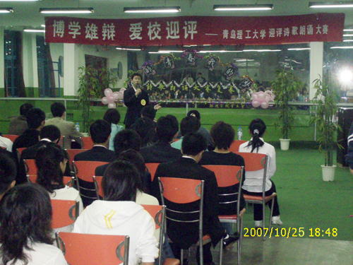 经过前期宣传发动、报名准备,18日,200多名选手分2组进行了紧张激烈的初赛,34位选手脱颖而出进入复赛。25日晚,选手们内容丰富、声情并茂的朗诵引来掌声不断。伴着优美的旋律,参赛选手以青春情怀重新诠释了戴望舒、舒婷、食指等诗人的经典作品。而在同学们原创作品的朗诵中,不仅有对爱情、生活、未来的思索,还有对关于十七大、评估等热点的关注。经过角逐,表现优异的12位选手(包括组合)晋级最后决赛。