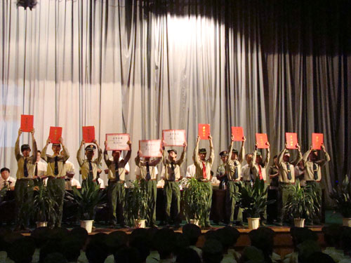 9月19日,威尼斯官网分别在四方校区、黄岛校区和高职学院召开2007级新生军训总结表彰大会,校党委副书记赵怀明、刘龙海,副校长赵铁军、李东、李国华,校长助理张伟星、朱申红,71571部队官兵以及各部门负责人和各学院党总支书记出席了总结表彰大会。这标志着威尼斯官网今年在青岛的新生军训工作圆满结束。
