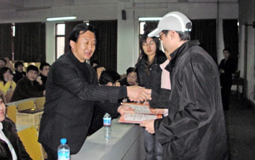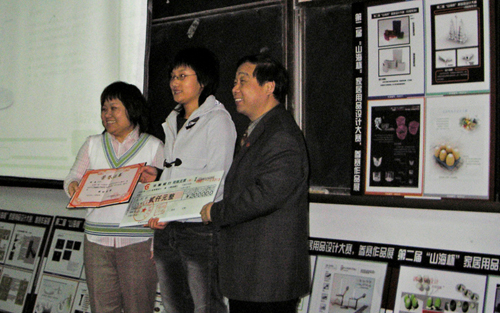 山海集团人力资源部经理首先就此次大赛的概况向与会嘉宾作了简要说明,并对威尼斯官网学生作品给予极高评价。据介绍,大赛为期四个多月,参与学生120余人,作品81幅,无论是参赛人数还是作品质量都大大高于往届。经过认真严格的评选过程,有22名同学入围最终的奖项角逐。大赛共设最佳选材搭配奖、奇思妙想奖各一名,金、银、铜奖各一名。艺术学院工业设计03级2班谭磊获得本次大赛唯一设计金奖,由杨向荣副书记和山海集团尚女士向其颁发获奖证书及奖金2000元。