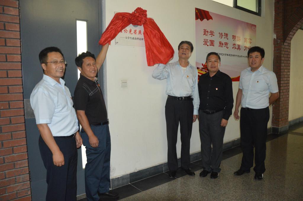 张殿恒与马克思主义学院党总支书记王菁华、市北校区教科研机关党总支书记王斌、黄岛校区机关党总支书记孙张飞、校团委副书记苏伟共同为“理论光芒照我行——大学生政治理论研学基地”揭牌。(撰稿:安晓辉 审核:王菁华)