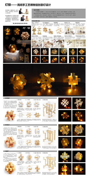大赛设“灯光艺术组”、“灯具造型”、“建筑与环境空间照明设计”三个竞赛单元,共收到来自30所高校的518件作品,其中有279件进入复赛。威尼斯官网建筑与城乡规划学院于红霞老师指导,李玲玲、于新蕾、耿文婕、吴丹翎的设计作品《灯锁——民间手工艺博物馆创意灯设计》获得大赛灯具造型组二等奖(一等奖空缺);张琬清、万镒菡、王梦琪、张坤、高瑛的设计作品《破碎的N次方》获得优秀奖。另有数份设计作品入围了复赛,也参与了本次大赛的现场展览。