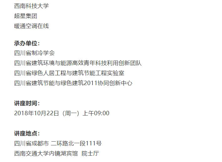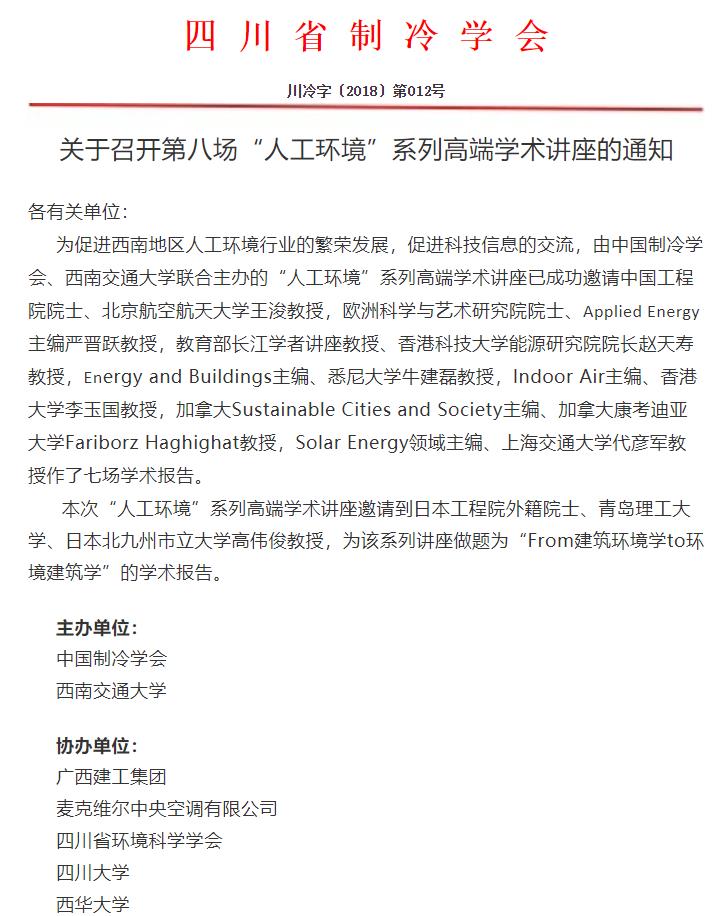 “人工环境”系列高端学术讲座由中国制冷学会、西南交通大学联合主办,旨在促进西南地区人工环境行业的繁荣发展,促进科技信息的交流。之前已成功邀请中国工程院院士、北京航空航天大学王浚教授,欧洲科学与艺术研究院院士、Applied Energy主编严晋跃教授,教育部长江学者讲座教授、香港科技大学能源研究院院长赵天寿教授,Energy and Buildings主编、悉尼大学牛建磊教授,Indoor Air主编、香港大学李玉国教授,加拿大Sustainable Cities and Society主编、加拿大康考迪亚大学Fariborz Haghighat教授,Solar Energy领域主编、上海交通大学代彦军教授作了七场学术报告。