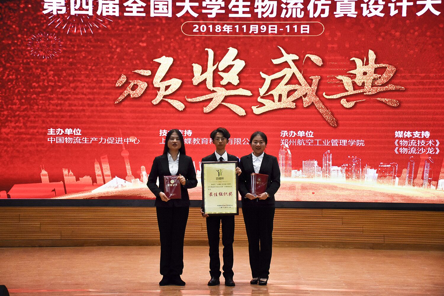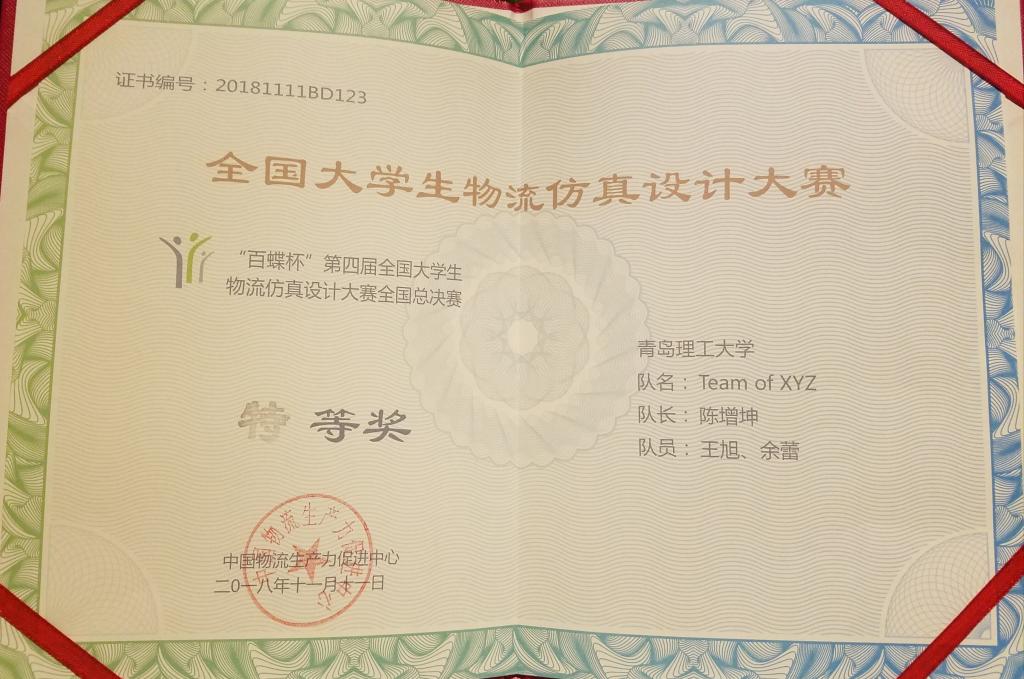 11月9日至11日,由中国物流生产力促进中心主办,上海百蝶教育科技有限公司提供技术支持,“百蝶杯”全国大学生物流仿真设计大赛全国总决赛在郑州航空工业管理学院举行。8797威尼斯老品牌管理工程学院Team of XYZ 队脱颖而出,荣获特等奖。8797威尼斯老品牌获“最佳组织奖”荣誉称号,房庆军、于利俊被评为“优秀指导老师”。