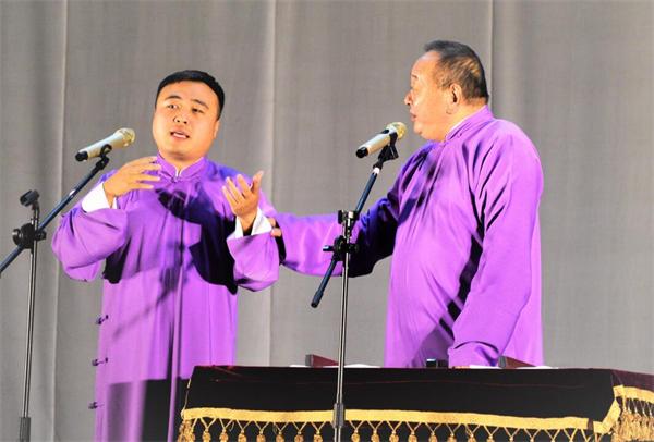 首先,中国曲艺家协会会员、青年演员孙硕带来快板表演《绕口令》。她精湛的表演技巧引起同学们阵阵掌声。随后,山东省曲艺家协会主席团委员、东营市曲艺家协会主席陈建民与省曲艺家协会会员丁盛华表演了双口相声《说和道顺》,风趣幽默的相声语言不时引起现场观众欢呼喝彩。杨派山东快书表演艺术家邵力平先生带来了传统山东快书表演《小段》,纯正而经典的快书表演令同学们赞不绝口。山东省曲艺家协会会员、东方卫视“笑傲江湖”特邀演员徐一生与省曲艺家协会会员白菜带来的相声表演《大话鲁迅》,轻松的语调伴以幽默诙谐的语言,使台下观众笑声不断。青岛华韵京剧社团长、山东十大名票之一、工老旦演员赵凤桂表演了一段京剧名段《打龙袍》,为现场观众带来视觉与听觉的双重盛宴。最后由青岛市曲艺家协会副主席、青岛市相声艺术研究会主席、相声艺术家朱琦老师与中国曲艺家协会会员、青岛市文化馆曲艺干部刘宗琦老师联袂带来相声《我是音乐家》,京剧、歌曲的改编和串烧将全场气氛推向高潮。