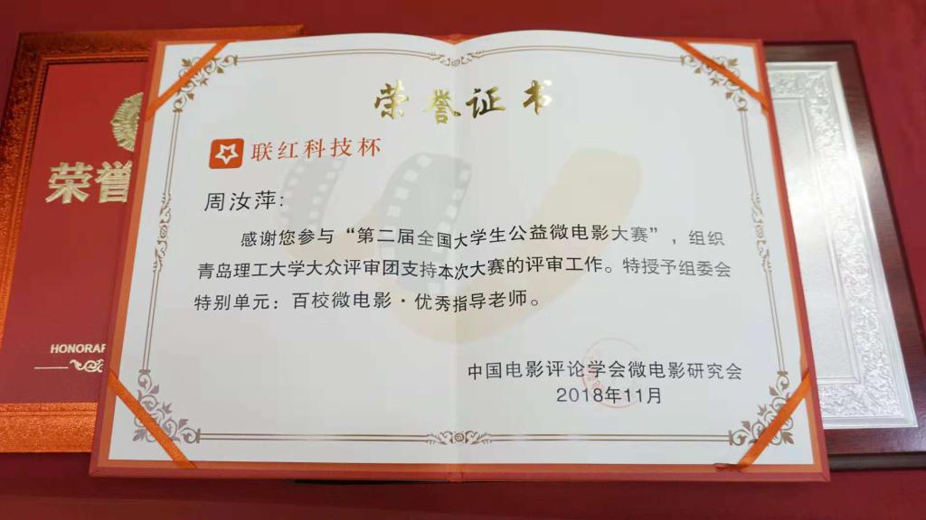 第二届全国大学生公益微电影大赛从2018年2月1日启动以来,得到了国内一百多所高等院校、影视行业协会的支持,共征集作品1200余部。周汝萍和王晓东老师,积极支持影视文化发展,从首届公益微电影大赛开始,连续两届组织学生报送作品,微电影作品《耕耘者》《舌尖上的青岛理工》《小航快跑》《拾年》《假如明天毕业》、剧本《开往春天的地铁》等在大赛中获得好评。